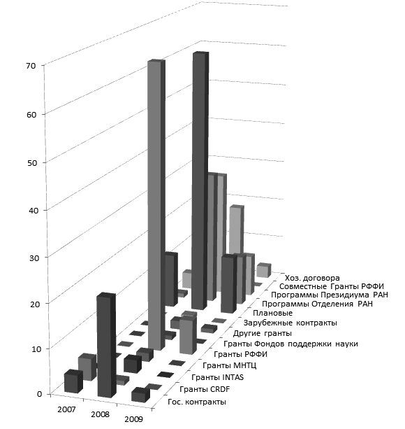 Объект "Наименование программы, в рамках которой выполнена работа". Работы классифицируются по следующим группам: Плановые работы, Программы Президиума РАН, Программы Отделения РАН, Гранты РФФИ, Совместные гранты РФФИ, Государственные контракты, Хоздоговора, Зарубежные контракты, Гранты МНТЦ, Гранты CRDF, Гранты INTAS, Региональные гранты, Персональные гранты поддержки ученых, Гранты фондов поддержки науки, другие гранты.