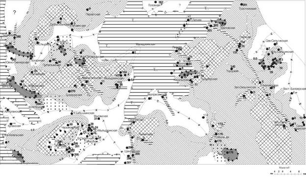 В центральной и северной частях Сильгинской СФЗ КВ развита чрезвычайно широко. В центральной части почти вся поверхность отложений палеозоя покрыта «плащом» измененных пород. Скорее всего, эта территория в позднепалеозойскую и раннеюрскую эпоху континентальной эрозии не являлась областью сноса и, следовательно, источником терригенного материала для мезозойского чехла. Выделяются лишь небольшие участки на Соболиной, Воскресенской, Летней, Вос- точно-Белоярской и Усть-Сильгинской локальных структурах, где отсутствуют КВ. Определенная система расположения последних позволяет представить «картину» палеоводоразделов в позднем палеозое: от скважины 176 Соболиной площади к скважине 174 того же поднятия; от скв. Воскресенской-2 и далее в пределах скв. Летней-1 и 2; от скв. Сенькинской-8 к Вос- точно-Белоярской-1 и далее к скв. Усть-Сильгинской- 12 (рис. 2).