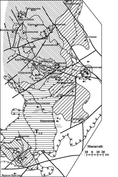 Рис. 3. Схема распространения преобразованных пород в кровле палеозоя Томь-Колыванской СФЗ.