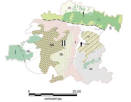 1. - Придолинный район; 2. - Заалатырское левобережье: 2А - Заалатырский ареал, 2Б - ареал водораздельного склона; 3. - Иресть-Руднинский район: 3А - Приирестьский ареал, 3Б - Прируднинский ареал пологого приводораздельного склона, 3В - Учуево-Ирестьский водораздельный; 4. - Рудня-Алатырское междуречье: 4А - Пелько-Алатырское междуречье; 4Б - Атьма-Руднинское междуречье; 5. - Поймы крупных рек