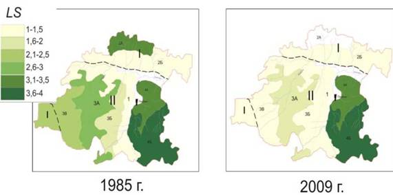 Наибольшее снижение LS (на 22 и 44%) произошло в морфологических ареалах Приок- ского полесья, где наиболее значительны доли заброшенных пашен (ареалы 2Б и 3В). На западе в Иресть-Руднинском морфологическом районе (ареалы 3А и 3Б) снижение составило 11%, а доля залежи - 19%. Для ареалов, где сокращение обрабатываемых земель было незначительным (ареалы 1, 4А), крайне слабыми оказались и изменения средних значений LS. Исключение представляет только юг Атьма-Руднинского междуречья (ареал 4Б). Доля заброшенной пашни здесь составляет 18.5%, но максимальный для региона эрозионный потенциал рельефа не изменился. Это связано с тем, что деградация системы землепользования затронула не только крутосклонные участки.