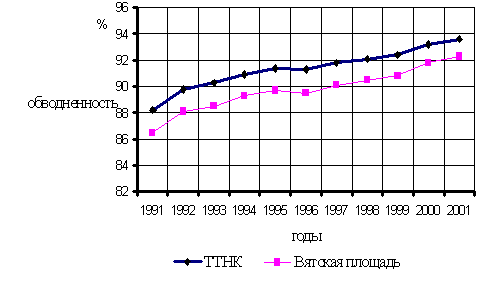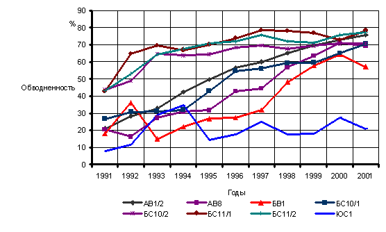 Все пласты за ис ключением ЮВ1, БВ1 и ЮС1 имеют обводненность более 60 %. В последнее десятилет на Ватьеганском и Южно-Ягунском месторождениях наблюдается прогрессирующий рост обводненности (рис. 3). На Ватьеганском месторождении она увеличилась в среднем на 50 %, на Южно-Ягунском - на 30 %. С увеличением глубины залегания пластов минерализация пластовых вод возрастает с 19,31 (БС10/2) и 19,39 г/л (АВ3) до 23,42 (ЮС1) и27,16 г/л (ЮВ1).