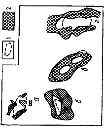 Выделение аномалий. В процессе математической обработки отдельно для каждого вида растений, произрастающих на определенных участках сопоставимых проб, устанавливаются аномальные содержания элементов в золе. Для выявления биогеохимических аномалий на планшет особыми значками или цветом выносятся содержания, значительно меньшие фонового, аномальные для двух и девяти коррелирующихся проб, а также для единичных проб. Затем выделяют “отрицательные” и “положительные” аномалии для каждого элемента на отдельном планшете. Потом составляется сводная карта аномалий с выделением на ней отдельных аномальных зон (рис. 5 приложения).