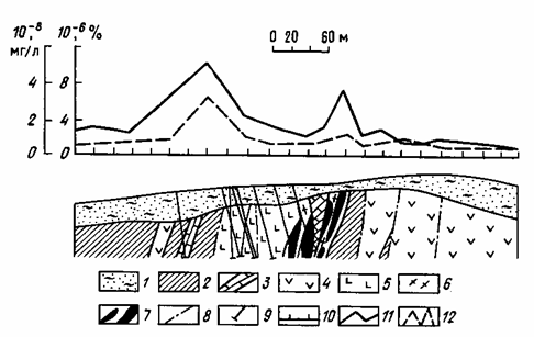 Несмотря на процессы самоочищения природных вод от содержаний рудных элементов, их повышенные, аномальные концентрации сохраняются в речных и подземных водах на расстояниях до 500—1000 м, иногда до нескольких километров от месторождений. Определяется это разнообразием форм нахождения рудных элементов в сложных многокомпонентных системах, которые представляют собой природные воды. Миграция рудных элементов в водах протекает в виде простых ионов, комплексных неорганических соединений с различными лигандами, в частности в анионной форме, а также в виде различных металлорганических соединений повышенной растворимости. Практика гидрохимических исследований подтверждает реальность обнаружения при поисках водных ореолов и потоков рассеяния рудных месторождений. Пример гидрохимического профиля представлен на рис. 1 приложения.