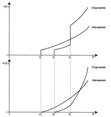 Изменения в производительности (φ), объеме выручки ( r ) и прибыли (π) фирм при международной торговле по сравнению с закрытой экономикой представлено на рис. 1. При международной торговле (по сравнению с автаркией) минимальная производительность фирм, имеющих неотрицательный выпуск, увеличивается с φ* a до φ*. Значение производительности, при котором фирмы начинают экспортировать, обозначено как φ* x .