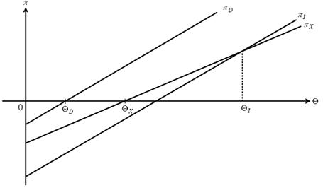 На рис. 2 показано, как зависит решение фирмы о начале внешнеэкономической экспансии и о форме этой экспансии от ее производительности. Ось абсцисс отражает производительность фирм (Θ), ось ординат — прибыль фирм (p). В отрасли существуют только фирмы с положительной величиной прибыли (π > 0). Линии π D , π I , и π X показывают зависимость прибыли от эффективности фирм, обслуживающих только национальный рынок, экспортирующих и осуществляющих ПЗИ соответственно.