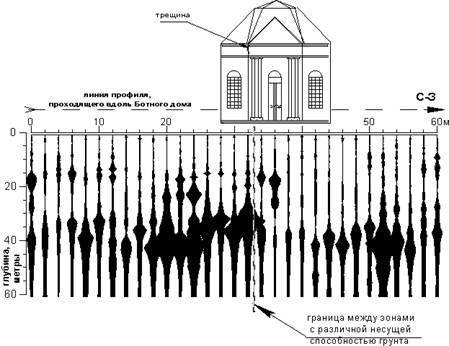Для выяснения причины этого, в 1997 году вокруг здания было осуществлено обследование методом ССП. На рис. 1 приведен ССП-разрез, полученный при профилировании в северо-западном направлении, вдоль фасадной стенки Ботного дома, в которой развивается трещина.