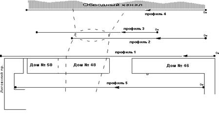 На рис.2 приведен план участка набережной Обводного канала вблизи домов N.48-50. При ведении строительных работ по расширению набережной, а именно, при забивке шпунта в дно канала, произошел провал грунта в зоне, оконтуренной эллипсом, через которую проходит подземный силовой кабель метрополитена, телефонные кабели и канализационный коллектор. Кроме того, в это же время началась интенсивная осадка и разрушение дома N 48.