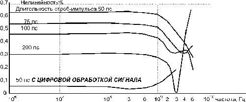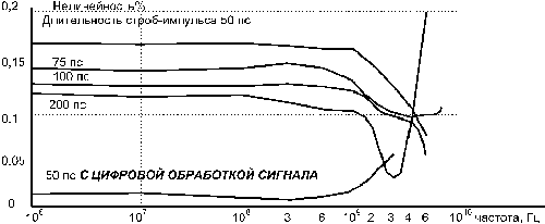 длительности стробимпульса 75 пс и емкости 0,5 пф нелинейность в диапазоне от