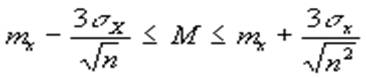 Посмотрев на формулу для математического ожидания mx, можно увидеть, что эта величина есть не что иное, как сумма большого числа случайных величин - отдельных наблюдений. Поэтому в силу центральной предельной теоремы величина mx подчиняется нормальному закону (см. рис.1), со средним (теоретическим) М и неизвестным стандартным отклонением S. Можно доказать, что S в Ц n раз меньше стандартного отклонения каждого отдельного наблюдения, для оценки которого можно использовать величину s х. Поэтому по правилу “трех s “ для Z - закона получаем, что с доверительной вероятностью р=0,997: