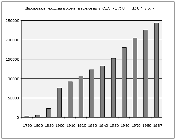 Динамику численности населения США (в тыс. человек) за 1790 - 1987 гг. мы можем видеть на следующей диаграмме.