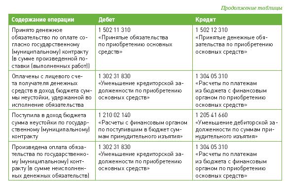 Операции по исполнению обязательств, принимаемых по государственному (муниципальному) контракту, а также операции по предъявлению требований по уплате неустоек, пеней, штрафов и исполнению указанных требований отражаются в бюджетном учете следующими проводками: