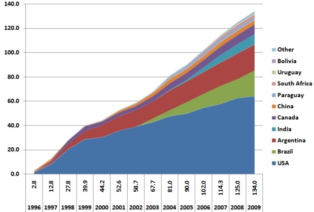 Площади сельскохозяйственного культивирования ГМО 2009. Изображение Fafner с сайта wikimedia.org