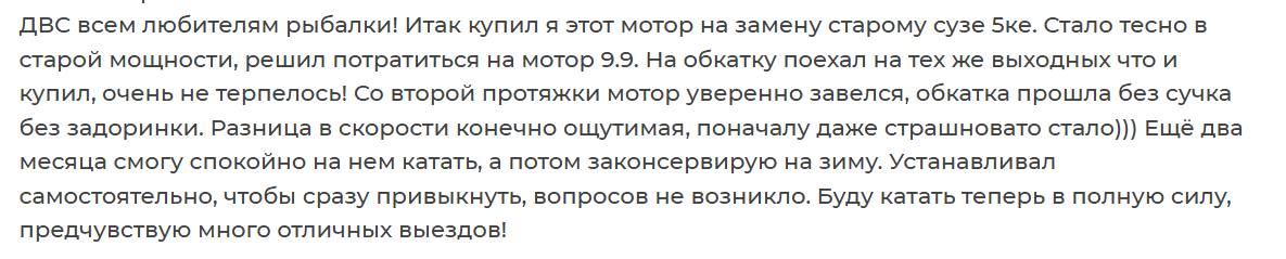 Таким образом, двигатель не нужно дорабатывать, менять винт из-за неправильной посадки или решать проблемы с запуском. Достаточно выбрать его под свои потребности. А после этого – просто установить на лодку и отправляться на рыбалку или в водное путешествие.
