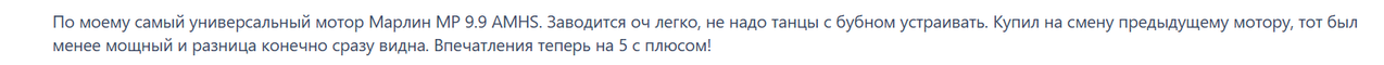 По отзывам владельцев, лодочный мотор Марлин 9.9 выбирают как универсальный двигатель для регулярных выходов на воду, когда важны предсказуемая тяга и умеренный расход, но не требуется дистанционное управление и электростартер. Владельцы описывают его как как добротно собранный, достаточно экономичный и тихий. Важное достоинство – двигатель не нужно регистрировать в ГИМС.