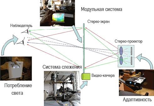 Чтобы решить данные проблемы, у специалистов и возникла схема адаптивного дисплея - не обычного стереодисплея, а адаптивной системы, которая каждому пользователю индивидуально показывает многоракурсную стереоинформацию. В общей зарисовке схема состоит из системы слежения за положением глаз человека, линзы, а также системы микропроекторов, строящих в области линзы увеличенное стереоизображение под каждый глаз, которое затем фокусируется на область их расположения.