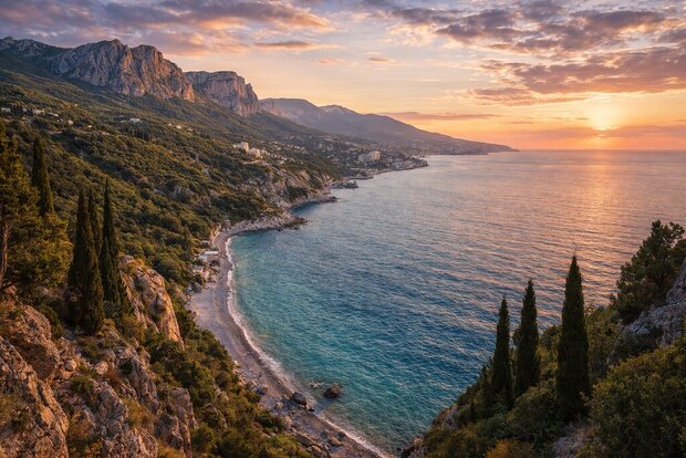 Южный берег Крыма традиционно считается самым популярным направлением. Здесь расположены Ялта, Алушта, Гурзуф и другие курортные города. Их объединяет сочетание горного рельефа и морского побережья, благодаря чему формируется узнаваемый ландшафт — узкая прибрежная полоса с горами, уходящими прямо к морю.