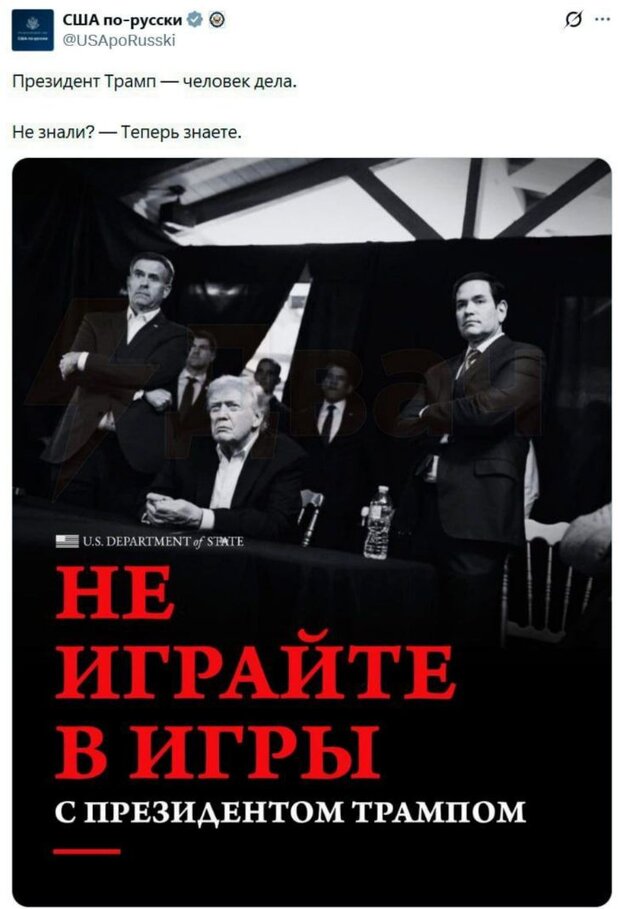 В русскоязычном аккаунте Госдепартамента США появилось изображение с призывом «не играть в игры» с президентом Дональдом Трампом. Аналогичное сообщение опубликовано в аккаунте департамента на фарси. Оригинал на английском языке ведомство распространило 3 января, после того как США провели операцию в Венесуэле, пишет РБК.