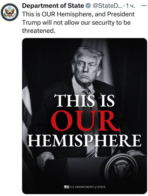 В основном аккаунте Госдепартамента США сегодня также появилось сообщение, где Западное полушарие назвали «нашим»: «Это наше полушарие. Президент Трамп не допустит угроз нашей безопасности».