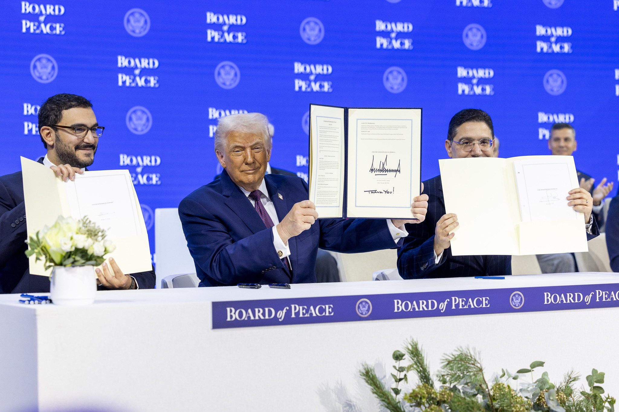 По словам Трампа, «всего год назад мир был охвачен огнем, многие об этом не знали». Однако «происходит много хорошего», и угрозы во всем мире «действительно утихают», заявил президент США во вступительной речи. Он поблагодарил присутствовавших на церемонии мировых лидеров.